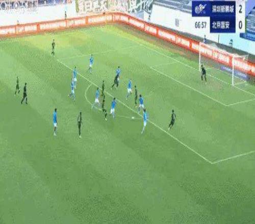 比赛第67分钟,何宇鹏横穿,张玉宁打空门得手。北京国安1比2深圳新鹏城。