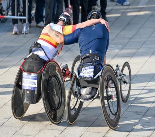 两名竞速轮椅选手冲过终点后互相搂着对方的肩膀。澎湃新闻记者 朱伟辉 图