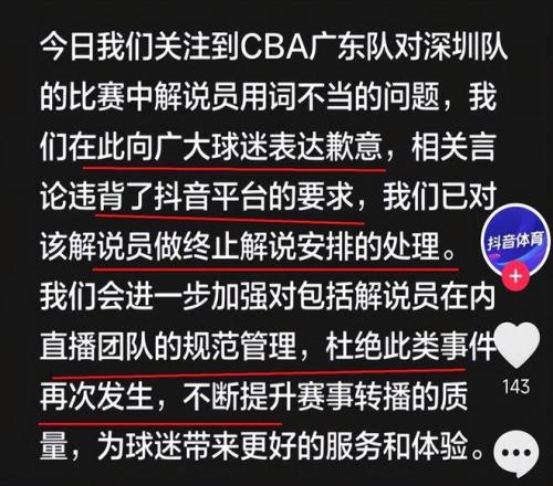 当然抖音CBA平台也及时进行危机关公,昨晚深夜对这场比赛的解说员进行了处理,并公开道歉,对当事人做出终止解说的处理。以后宋庭再也没有资格担任抖音CBA的解说了。媒体人和球迷也对宋庭进行了痛批。名记付政浩指出,媒体传播学中有个媒体困境预言叫“娱乐至死”,预言未来的传媒为了迎合大众的娱乐诉求,社会公共话语表述必将由曾经的理性和富有逻辑性变成肤浅、碎化,公众表述尽可能娱乐化直到足够低俗。他主张:体育解说员是需要专业门槛和专业培训的,一位合格的解说员,不仅要有体育专业知识储备、精确的表达能力和一流的解构能力,而且还要有职业敬畏感和文化差异的敏锐感知力,时刻绷紧多根弦,才能避免踩红线。