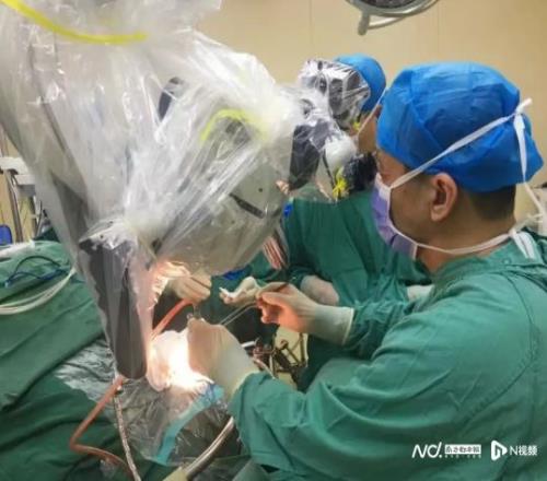 手术在高倍显微镜下进行,由彭彪主任主刀。他带领团队凭借丰富的临床经验和精湛技术,精准判断肿瘤边界,操作如“绣花”般细致,一分一毫谨慎分离,既避免了损伤视神经导致视力丧失,又保护了颈内动脉及其分支,在控制出血的同时确保大脑整体血供稳定。